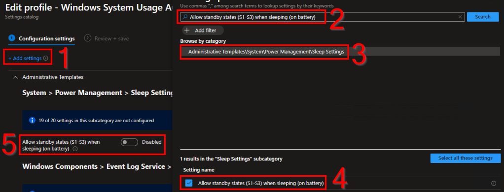 - Search for “Allow standby states (S1-S3) when sleeping (on battery)” and select the Sleep Settings result
