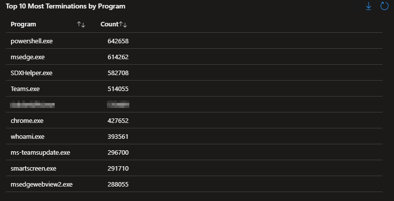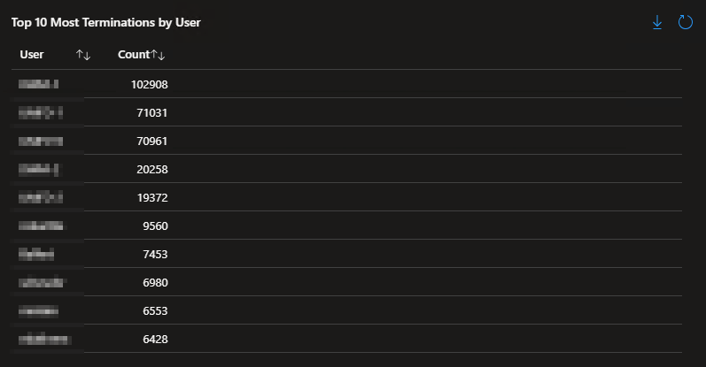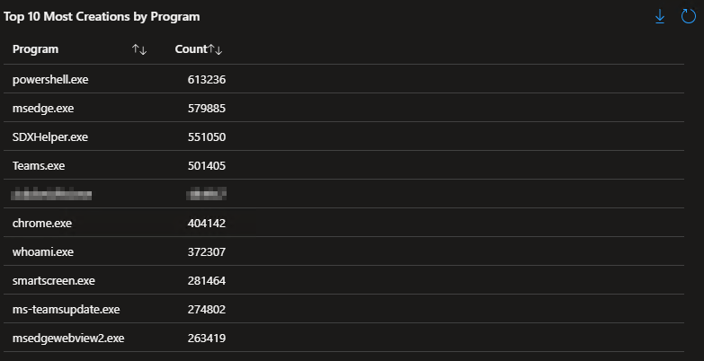 Continuing the same pattern, this list shows the top 10 creations by the launching user rather than the application. This allows us to quickly realize we have someone (or something) calling an unusually high number of processes compared to the norm.