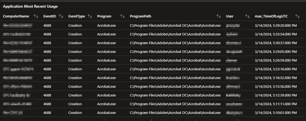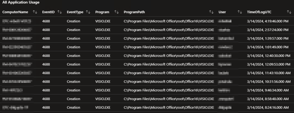 As an important note, this runs off the executable name, not the “application” name. For instance, we know Microsoft Word as simply “Word”, but its executable is WinWord.exe. Sometimes an application’s executable name is intuitive, sometimes it is not. This limitation is simply a result of the Windows event not logging the application’s common name; thus we can’t collect it.