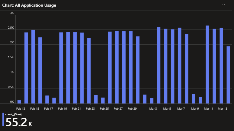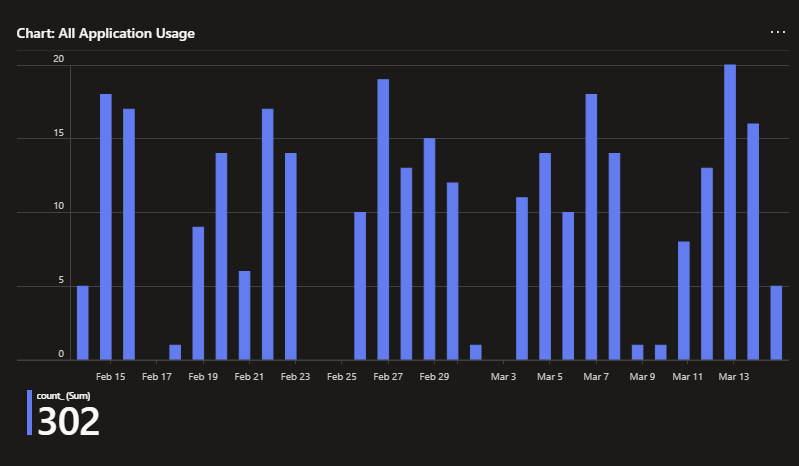 Lists are great and all, but sometimes you just need to see the data. Just like the above list, this chart only shows the most recent launch per unique combinations of the Computer Name, Program, Program Path, and User ID. In effect, this gives us an idea of how often an app is used by the audience that is using it.
