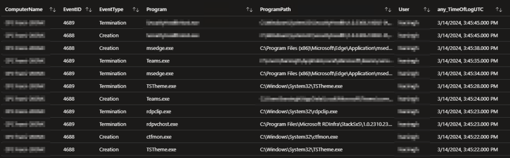 This can be great for knowing what a set of credentials is being used for as again seen on the dashboard. While this can be used to investigate basic questions like “What apps is this employee launching?”, it can also be used for more in-depth digging like seeing where something like a privileged admin account is being used to executive applications across devices. Or, perhaps a service account that is reaching out to many devices. I do want to be clear though, for example, this won’t capture someone authenticating to your machine over the network, but it would capture them calling the execution of something over the network. Unfortunately, the exact execution type (local, CLI, Network, etc) isn’t something that these events capture so adding on data from something like the System Usage tool would be needed.