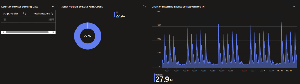 This is done with the help of three main charts. First, we have a simple list showing how many endpoints are checking in with what version of the collector script as of the most recent. Second, we have a breakdown of how many events are coming in with a given version of the collector. And third, we have a time chart showing the live feed of events coming in by what version of the collector.