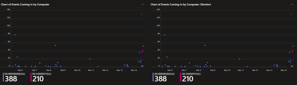 Second, this page has some direct ingestion monitoring. At the bottom are two charts with the same name, except one is “Distinct.” This is because the chart on the left shows a count of all events coming in per device, and the right chart shows the same thing except with a filter forcing it to only show distinct events (unique combinations of device name, user ID, path, program, etc). This lets us confirm the time tracking is working and not picking up duplicate events. This chart is used early on as another validation tool for your deployment to ensure no duplicates are coming in. However, the Distinct chart WILL break once you pass a certain data point or device threshold. I will say, it’s likely you will ingest some duplicates early on as part of the setup process but that should only be visible from the device you do the initial setup on.