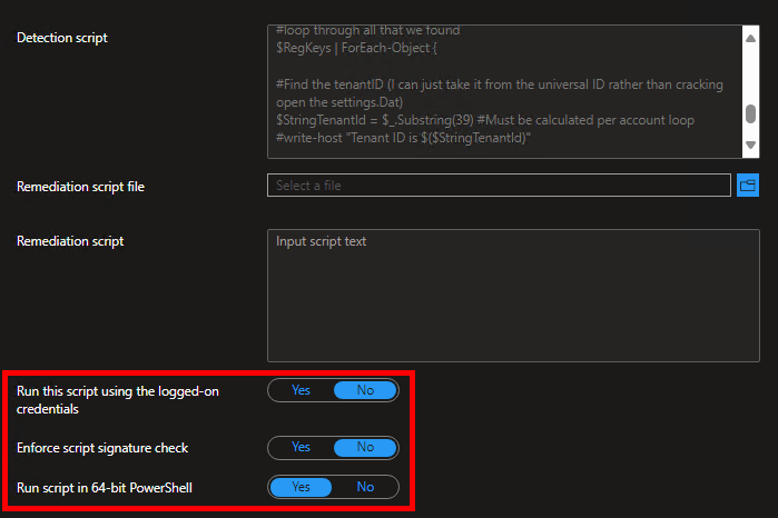 If you have a secondary account the script can’t see, and it’s not because of either of the above – did you just add it? Because that was something else seen in testing. To explain, it takes a moment for the Settings.dat file to get all its values, and for all the registry keys to get added, so make sure you don’t add an account and then immediately try to remove it, even if you do so via signing into an application. Realistically, this is a non-issue as any employee should not have just added an account before the script runs as you should already have the policy deployed to prevent this before you ever attempt remediation.