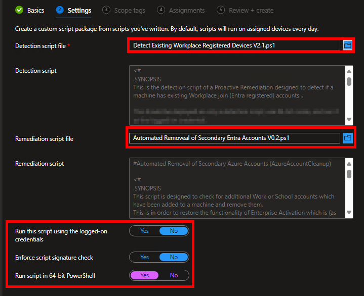 Note: I would recommend having TWO Proactive Remediation’s in Intune. One that has just the detection script, and one that has both the detection and remediation script. This is so your data collection with the detection script can be handled/scoped independently from the full remediation script.