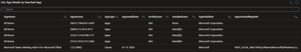 As mentioned above, the new beta version of the script was created to collect information about Appx packages installed on devices, which the current V1.2 is entirely blind to. For example, Microsoft Teams is no longer an MSI piece of software registering to the HKLM:\SOFTWARE\Microsoft\Windows\CurrentVersion\Uninstall (or the 32-bit equivalent), the place where we previously pulled all app data from, and is instead a Appx package installed on the machine. So, we need to now collect additional applications in this new way such that we can truly see what all is out there.