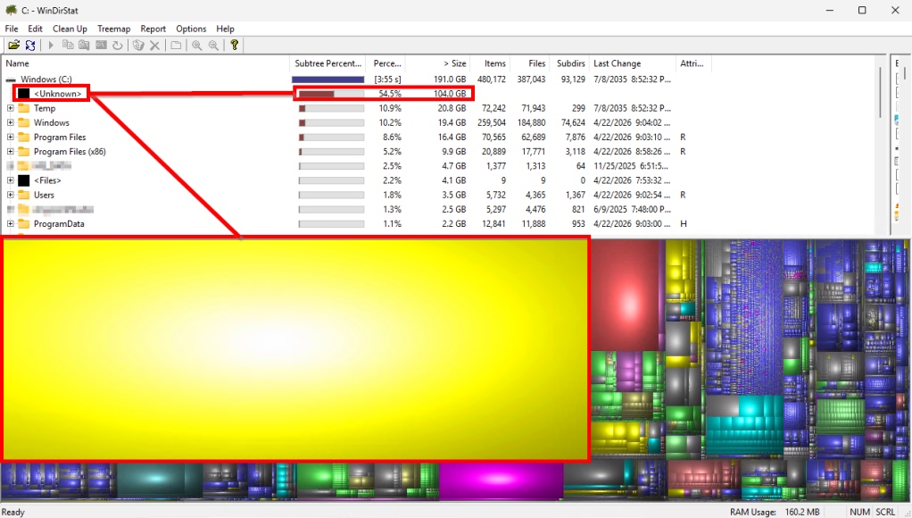 This week, 4/20/2026, I have seen a rapidly growing quantity of devices that have run out of disk space. Early investigation struggled to understand why, as WinDirStat could not locate this space. If, under options, we enabled it to display “Unknown,” it was seeing huge quantities of consumed space it couldn’t explain (anywhere from 50-200GB), similar to what is shown below.