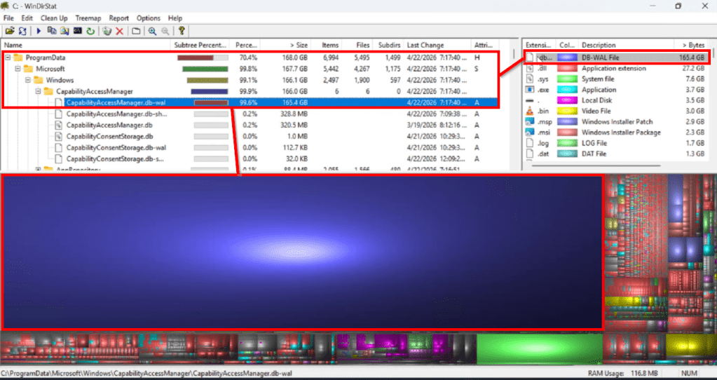 …We can now run WinDirStat as the System account to try and find these files. What this revealed on every station we tried it on was that the file “C:\ProgramData\Microsoft\Windows\CapabilityAccessManager\CapabilityAccessManager.DB-wal” had grown to utterly ridiculous sizes (50-200GB). That’s not normal.